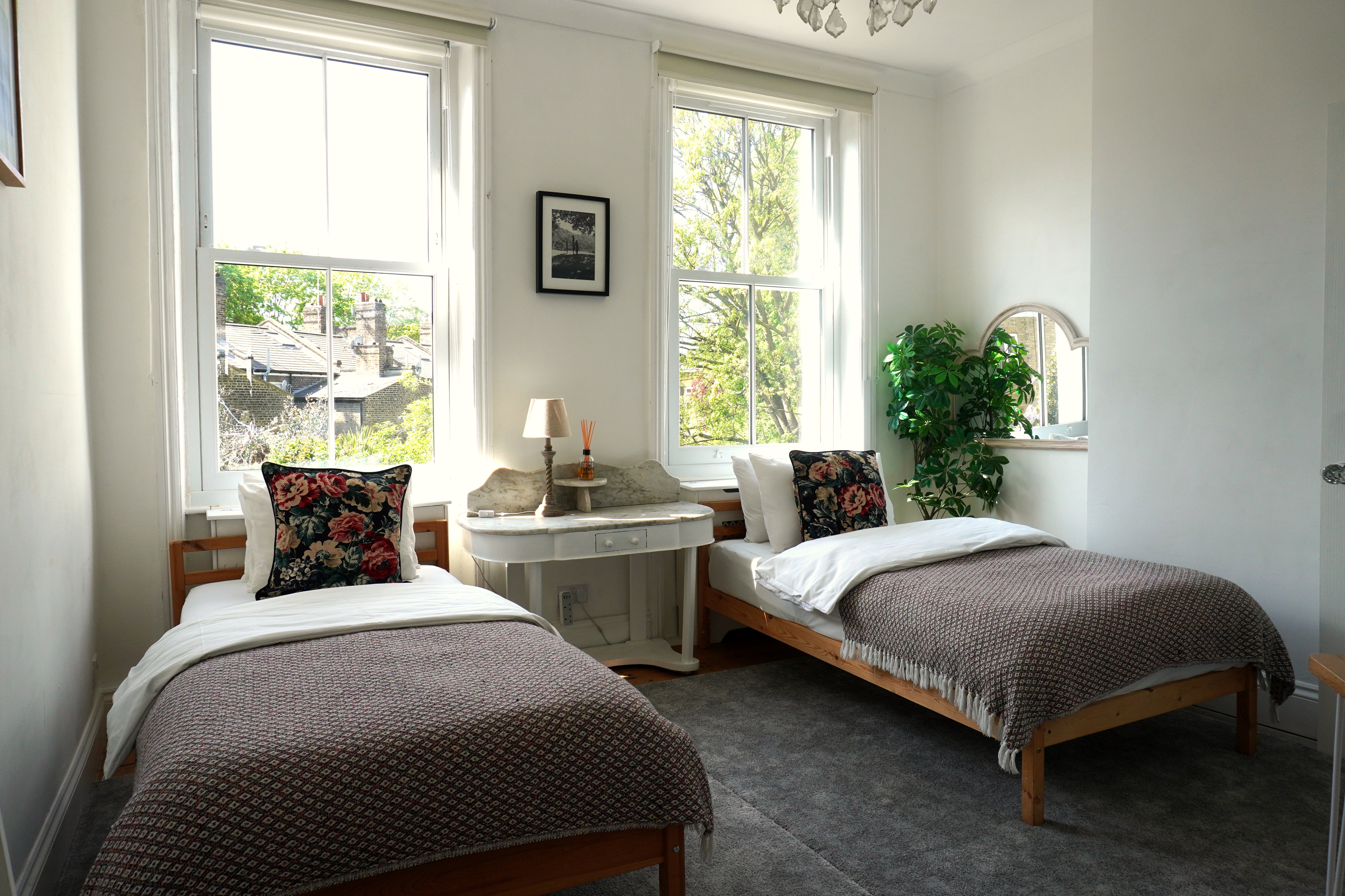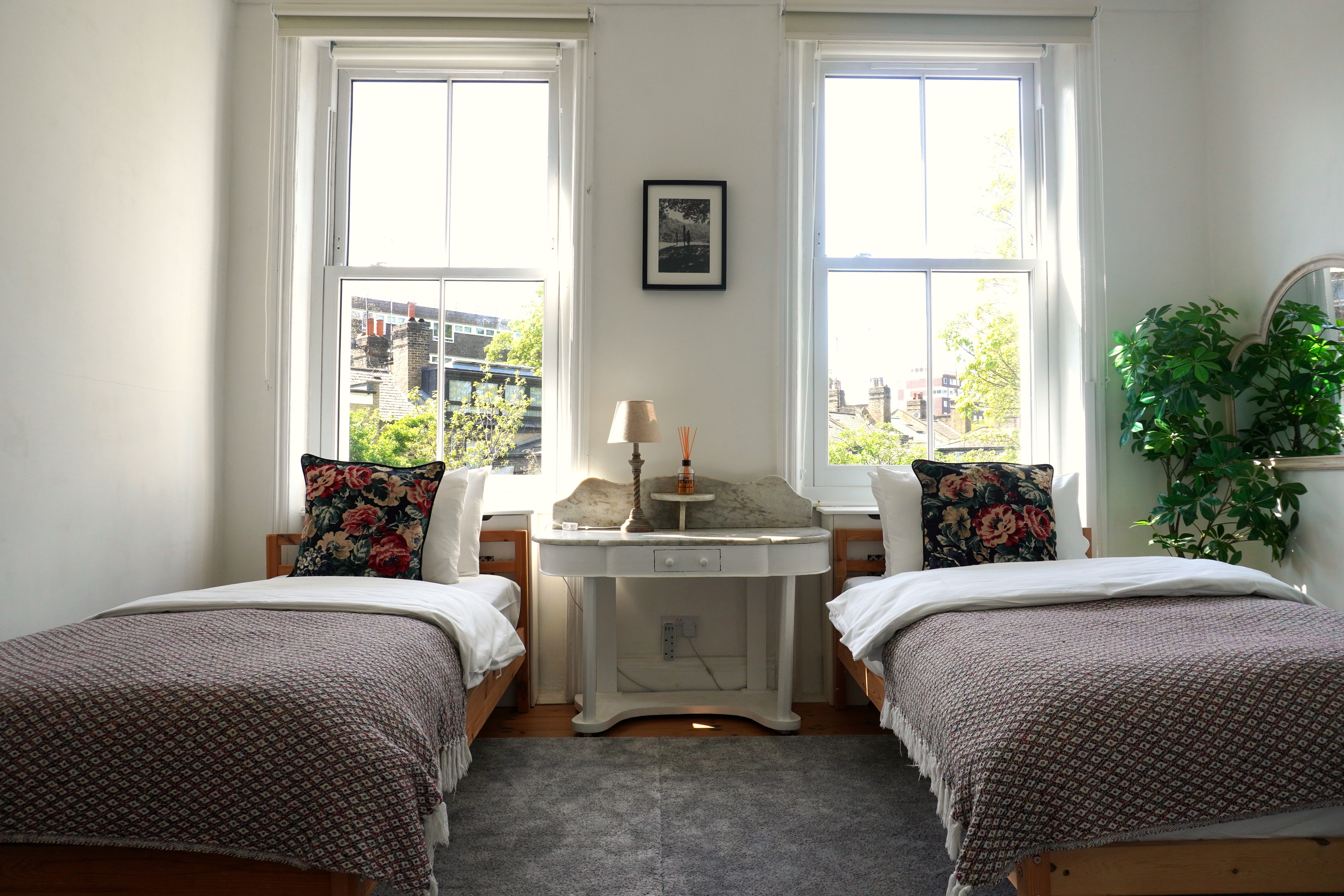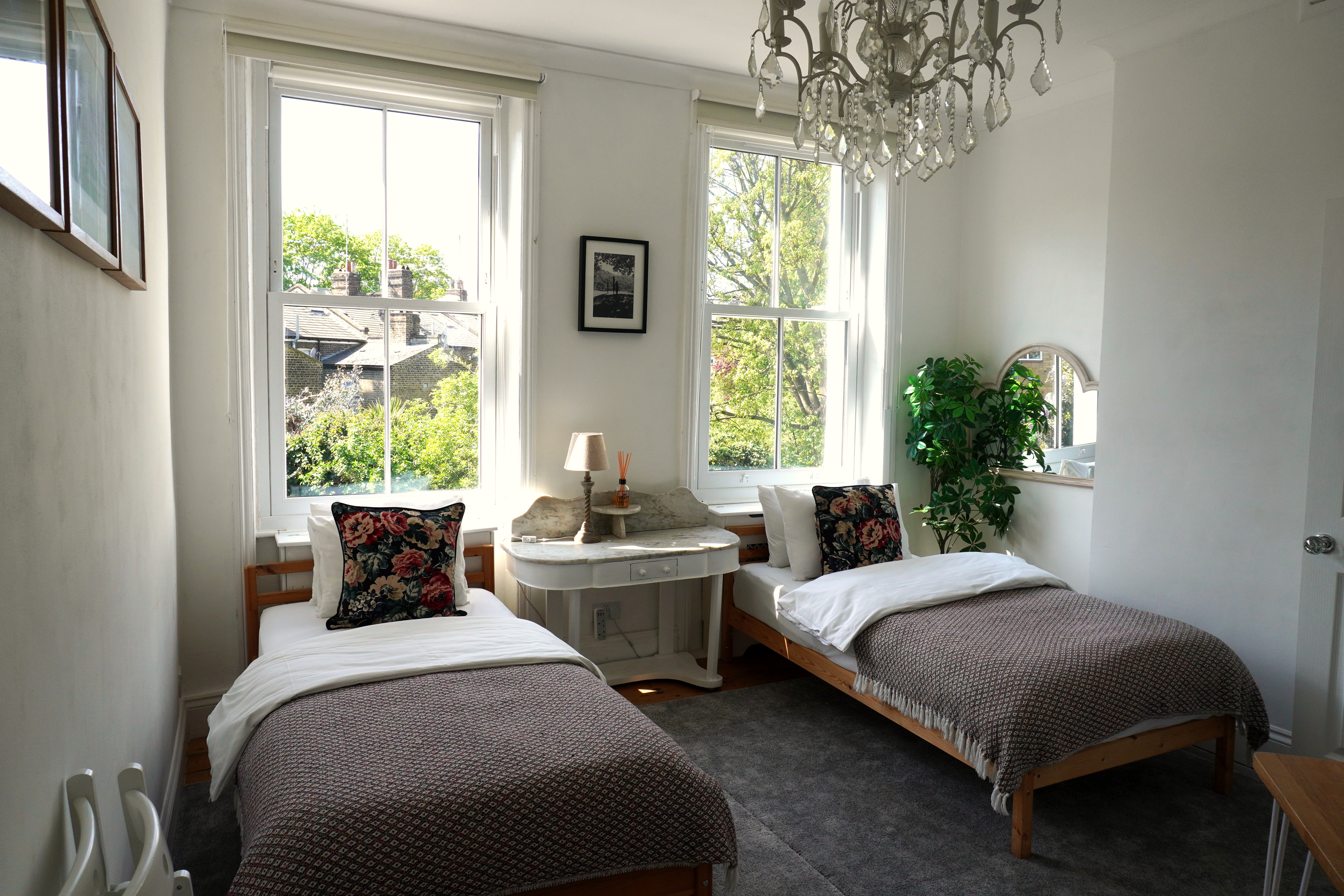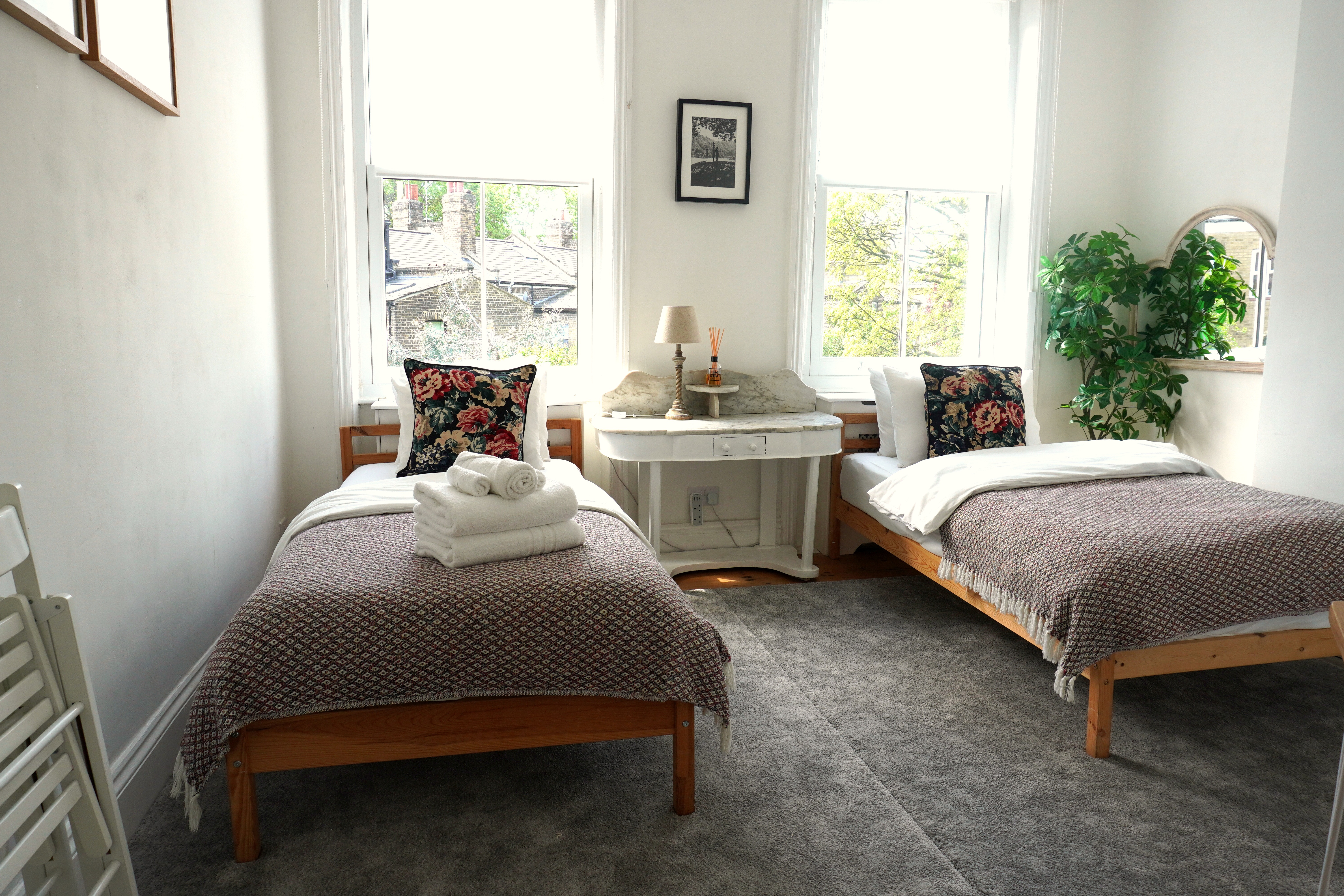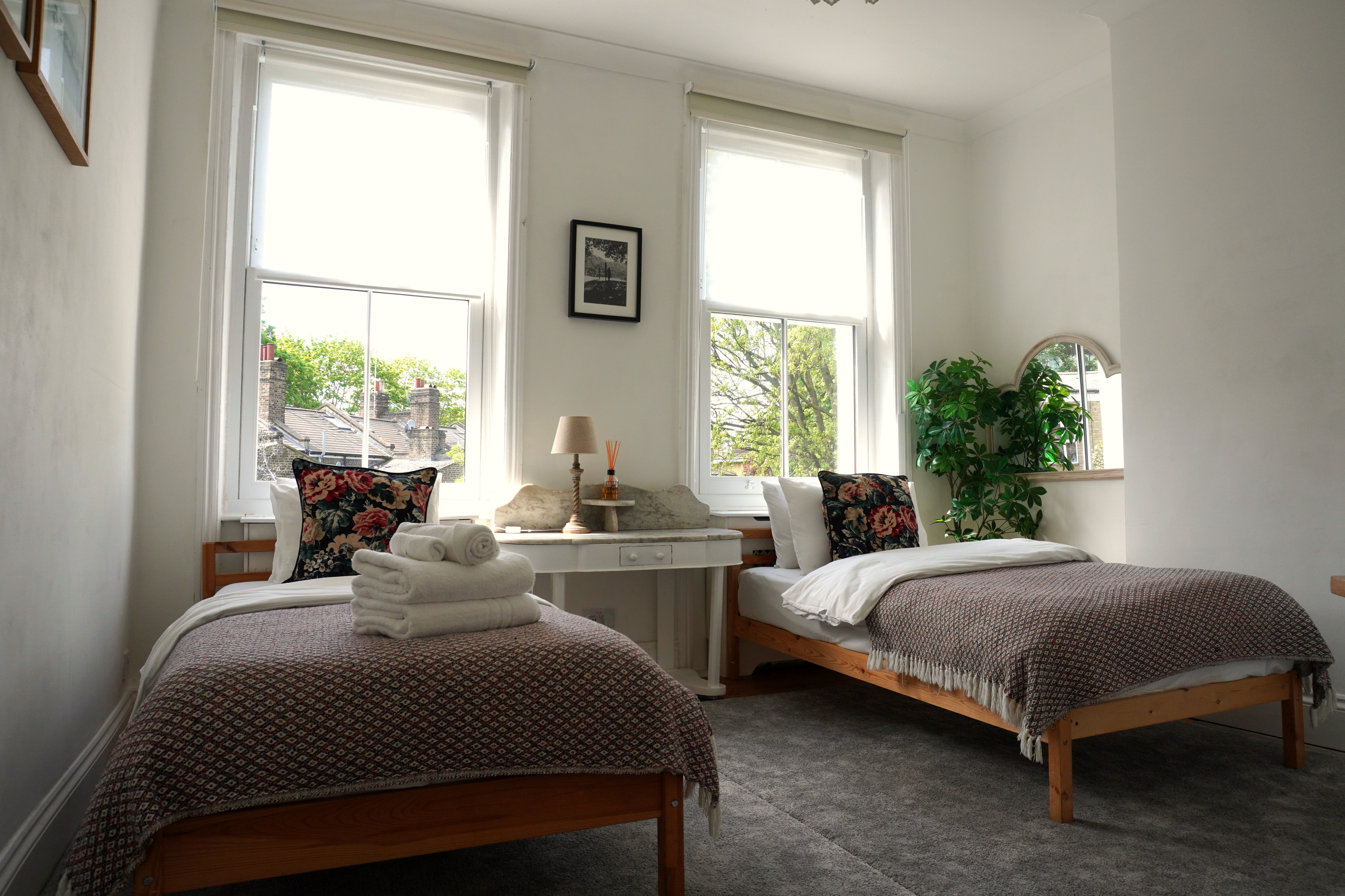 South-facing Twin room in a Period Victorian house. Private room with ensuite, high ceilings, two beds, laptop-friendly workspace, Wi‑Fi, heating, hot water, hair dryer, iron, ironing board, smoke detector, first-aid kit. Maximum 2 guests. Located in London Fields/Hackney Central (E9), walkable to Victoria Park, London Fields and Broadway Market; Hackney Central and London Fields stations under 10 minutes to Liverpool Street. Ideal for professionals or couples.