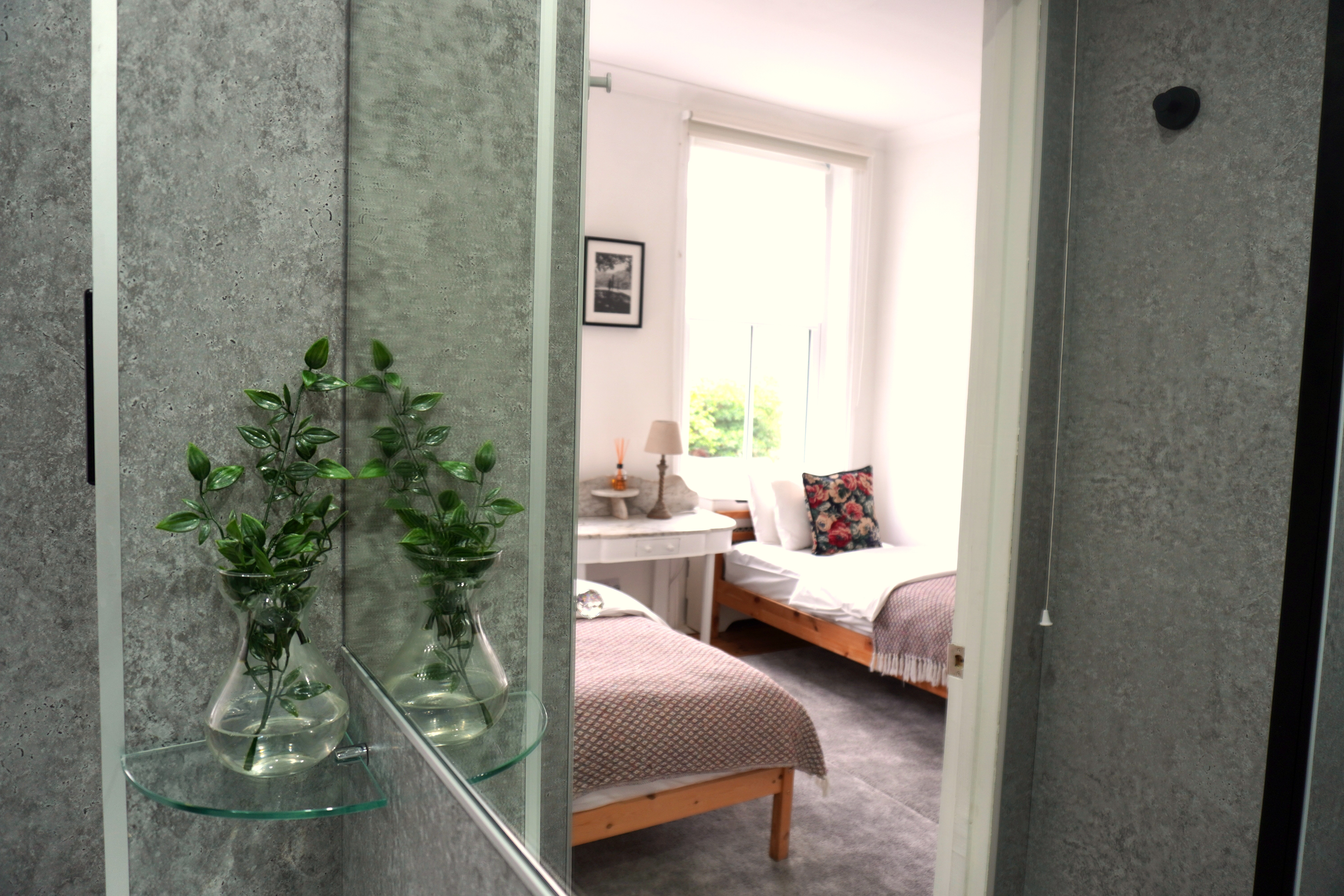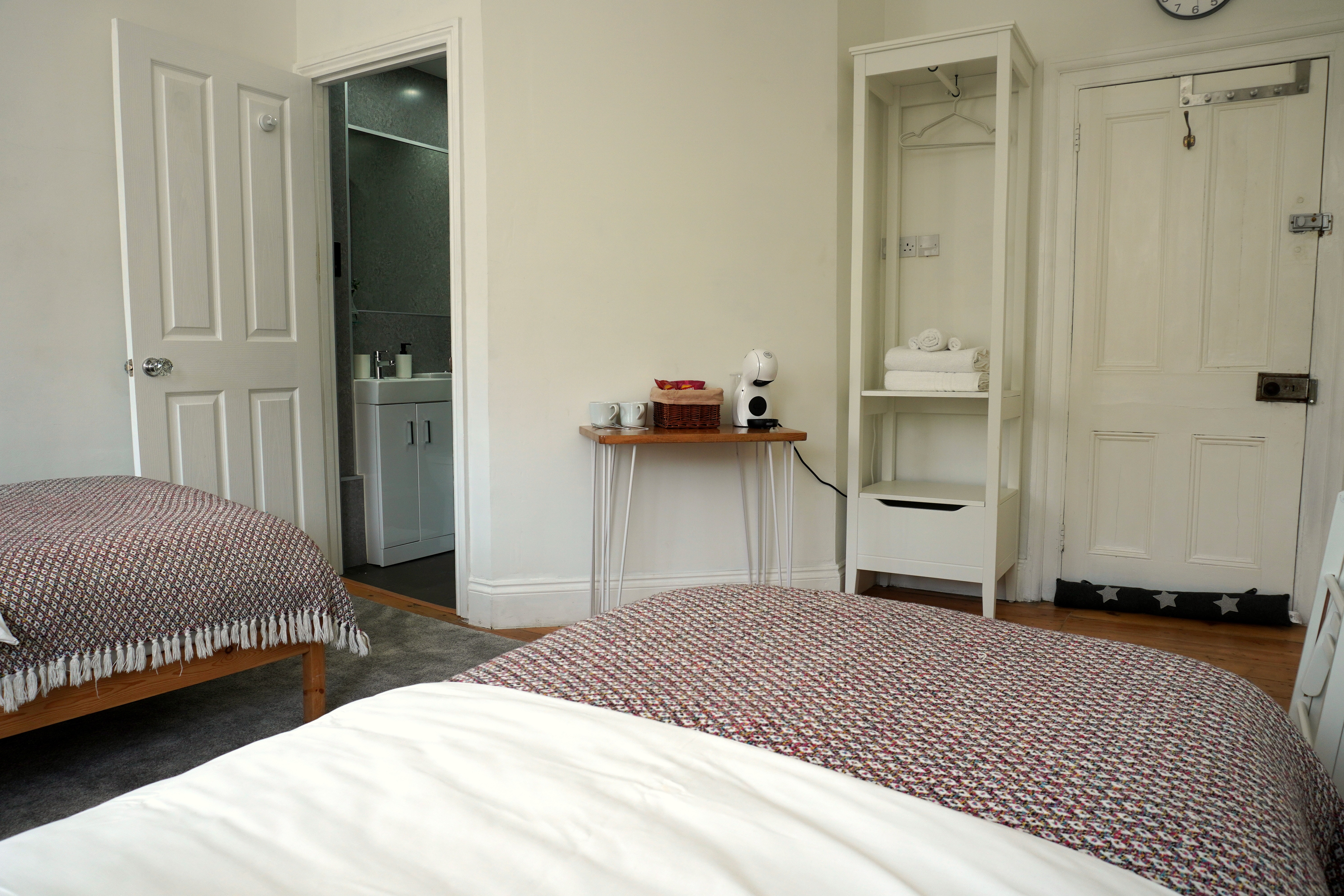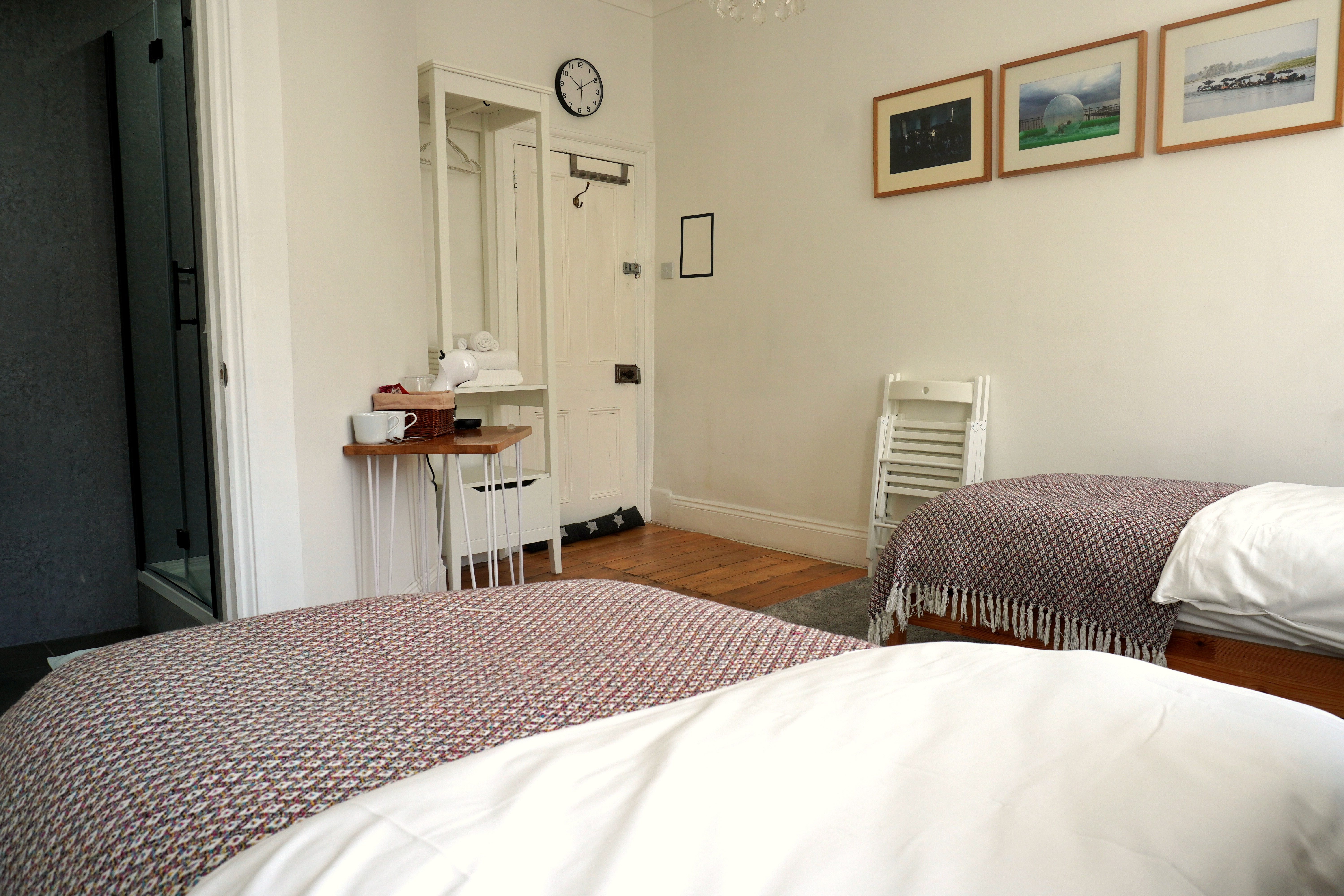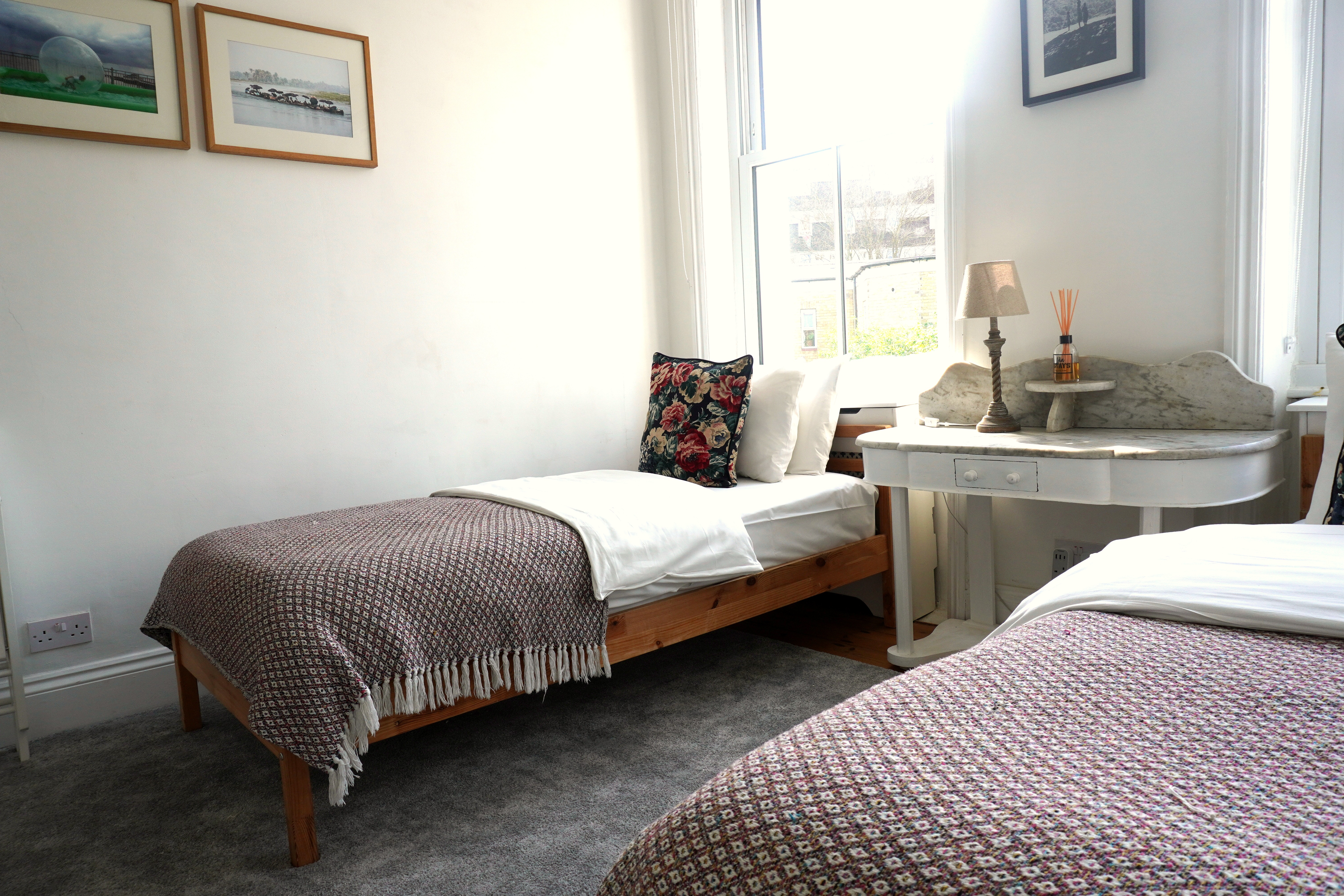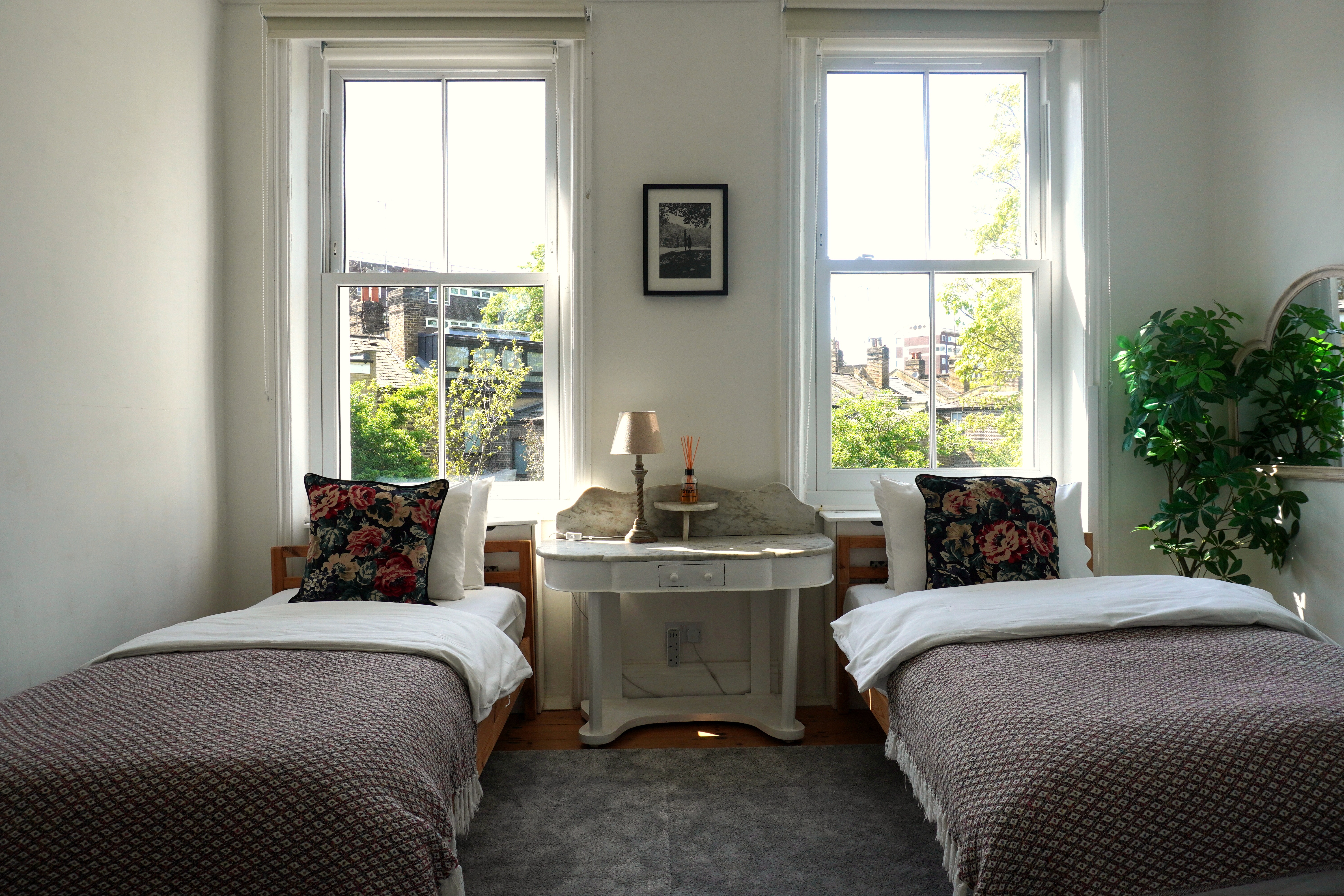 South-facing Twin room in a Period Victorian house. Private room with ensuite, high ceilings, two beds, laptop-friendly workspace, Wi‑Fi, heating, hot water, hair dryer, iron, ironing board, smoke detector, first-aid kit. Maximum 2 guests. Located in London Fields/Hackney Central (E9), walkable to Victoria Park, London Fields and Broadway Market; Hackney Central and London Fields stations under 10 minutes to Liverpool Street. Ideal for professionals or couples.